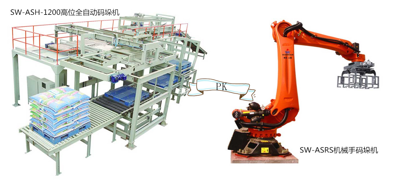 機(jī)械手碼垛機(jī)眾所周知有如人手一般的裝置,棗莊三維機(jī)械手碼垛機(jī)SW-ASRS主要由壓平整理、緩沖輸送機(jī)、抓取輥道、托盤機(jī)、機(jī)械手等裝置組成。整個碼垛的過程首先由輸送機(jī)將合格的包裝袋輸送到整平機(jī)進(jìn)行壓袋整平,使袋形平整,包裝袋到達(dá)抓取輥道后機(jī)械手檢測到來袋的包裝袋對其進(jìn)行抓取、轉(zhuǎn)向、堆放、分層進(jìn)行碼放,從而完成整個碼垛工序。而它像人手一般的機(jī)械手裝置有一個缺點,如果來袋的包裝袋袋型不夠整齊會導(dǎo)致抓袋時將包裝袋抓破。因為機(jī)械手結(jié)構(gòu)簡單安裝方便前期投入少、可同時碼垛不同規(guī)格型號的來料成品,也滿足3條輸送線來料的碼垛需求的特點,所以上市以來倍受眾多客戶的青睞。而棗莊三維不但有機(jī)械手這個結(jié)構(gòu)小巧安裝簡單的碼垛機(jī)外,還有一款不會將包裝袋抓破的全自動碼垛機(jī)SW-ASH-1200高位全自動碼垛機(jī),顧名思義高位碼垛機(jī)安裝高度相對機(jī)械手碼垛機(jī)來說要高出許多,而且高位全自動碼垛機(jī)只能碼垛一種規(guī)格一條輸送線來料的成品碼垛需求,而且相對機(jī)械手而言前期投入成本多出接近10倍,所以客戶一般都很少關(guān)注。但是高位碼垛機(jī)碼垛速度能達(dá)到1600包/小時,垛型整齊美觀牢固,是較傳統(tǒng)的人工碼垛效率高,這是機(jī)械手無法比擬的,而且所有包裝袋的袋口朝里,可實現(xiàn)自動編組分層。而機(jī)械手一般可碼垛800包/小時,雙手的可達(dá)到1000包/小時的碼垛速度;一般的機(jī)械手碼垛機(jī)可用6-8年,而高位全自動碼垛機(jī)可使用100年,使用壽命高出12倍還多;高位碼垛機(jī)可在任何地區(qū)使用,而機(jī)械手碼垛機(jī)不能在高原地區(qū)使用,多用于北方地區(qū);機(jī)械手碼垛機(jī)每年會產(chǎn)生1-3W的保養(yǎng)維護(hù)費(fèi),而這項費(fèi)用高位碼垛機(jī)沒有,長期以往節(jié)省不少開支。