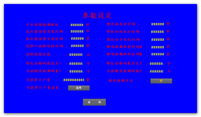 6、當前斷線檢測碼數1和碼數2是顯示當前實際檢測到的不斷線狀態下縫完一包編碼器記錄的碼數,此參數不可設置,僅為縫包合格碼數設定提供參考依據。