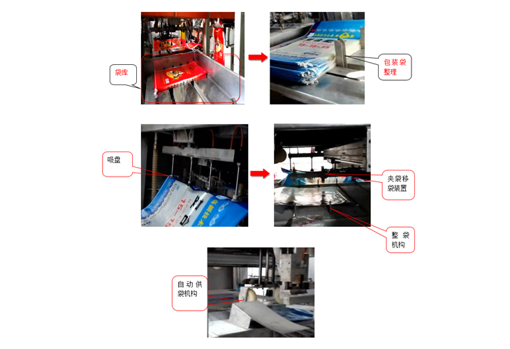 自動(dòng)上袋系統(tǒng)主要包括開袋裝置和機(jī)械手上袋裝置,運(yùn)行過程如圖: