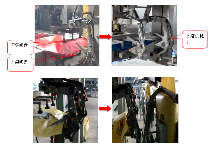 上袋裝置中開袋吸盤從包裝袋口上下兩個(gè)方向同時(shí)將包裝袋口吸開,上袋機(jī)械手伸入袋口內(nèi),將袋的上下兩面同時(shí)夾住,彎曲機(jī)械臂將包裝袋套到定量包裝秤下料口,過程結(jié)束。